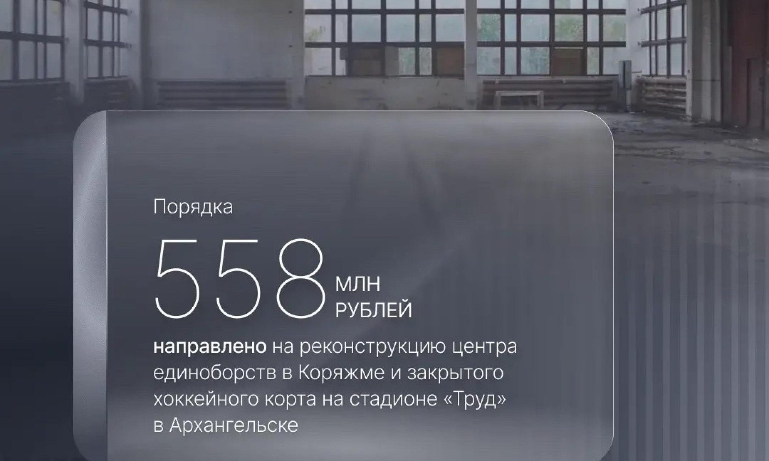 Реконструкция затронет центр единоборств в Коряжме и закрытый хоккейный корт на стадионе «Труд» в Архангельске. Оба проекта получили поддержку из федерального бюджета, общий объем финансирования составит около 558 млн рублей.